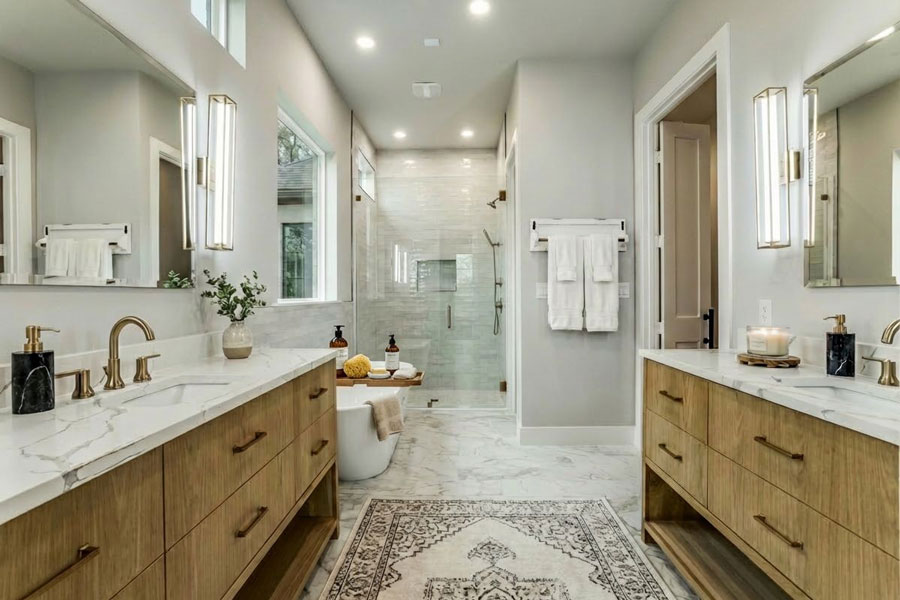 Primary Suite: double sinks, soaking tub, walk-in shower and vanity